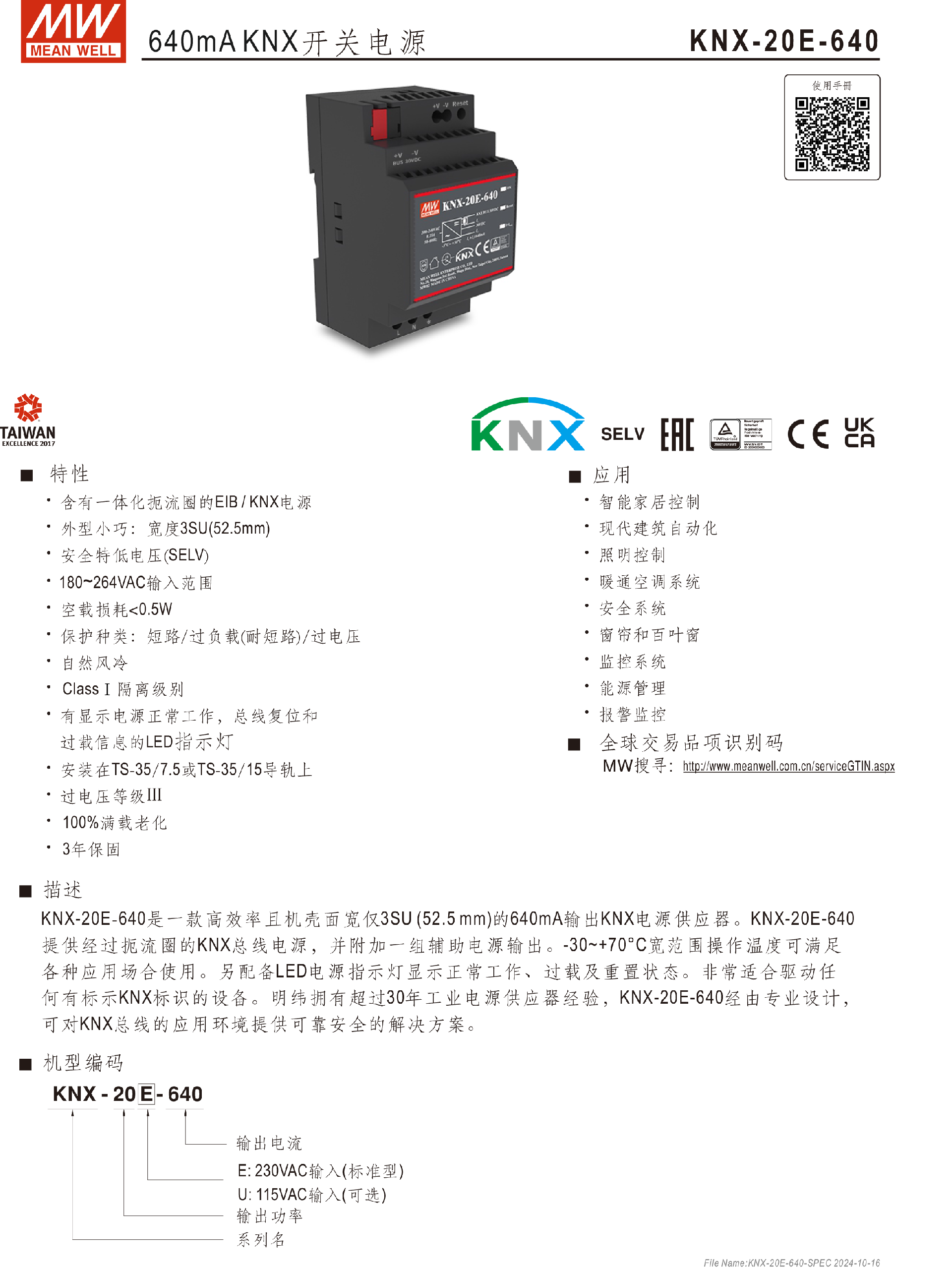 臺灣明緯640mA KNX開關(guān)電源KNX-20E-640