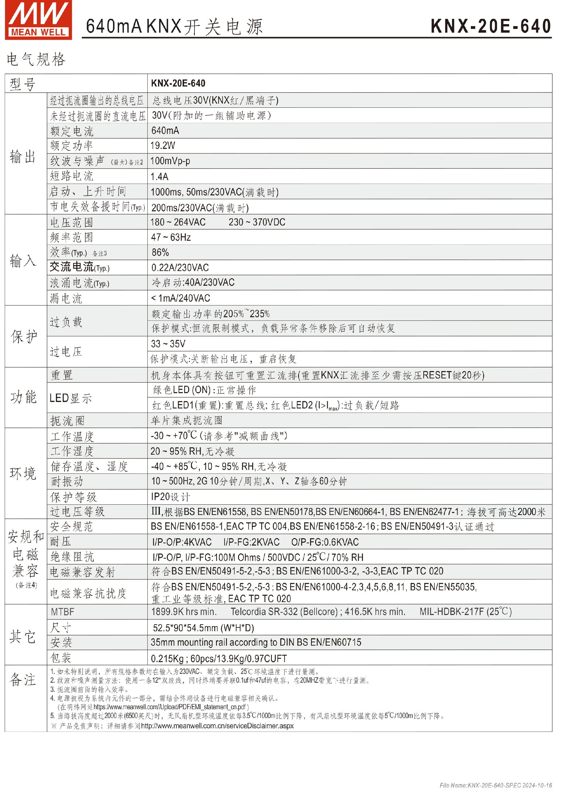 • 臺灣明緯640mA KNX開關(guān)電源KNX-20E-640