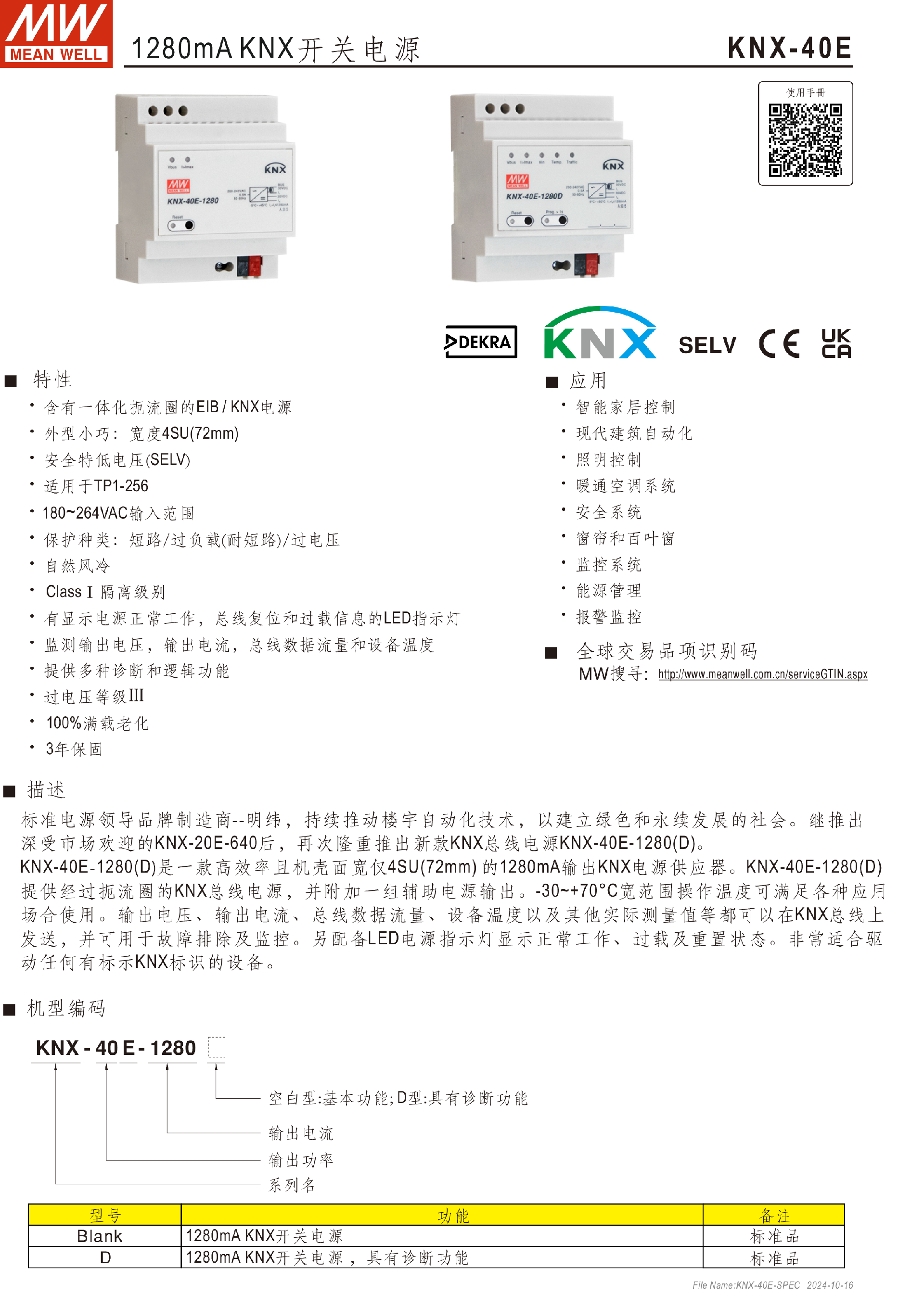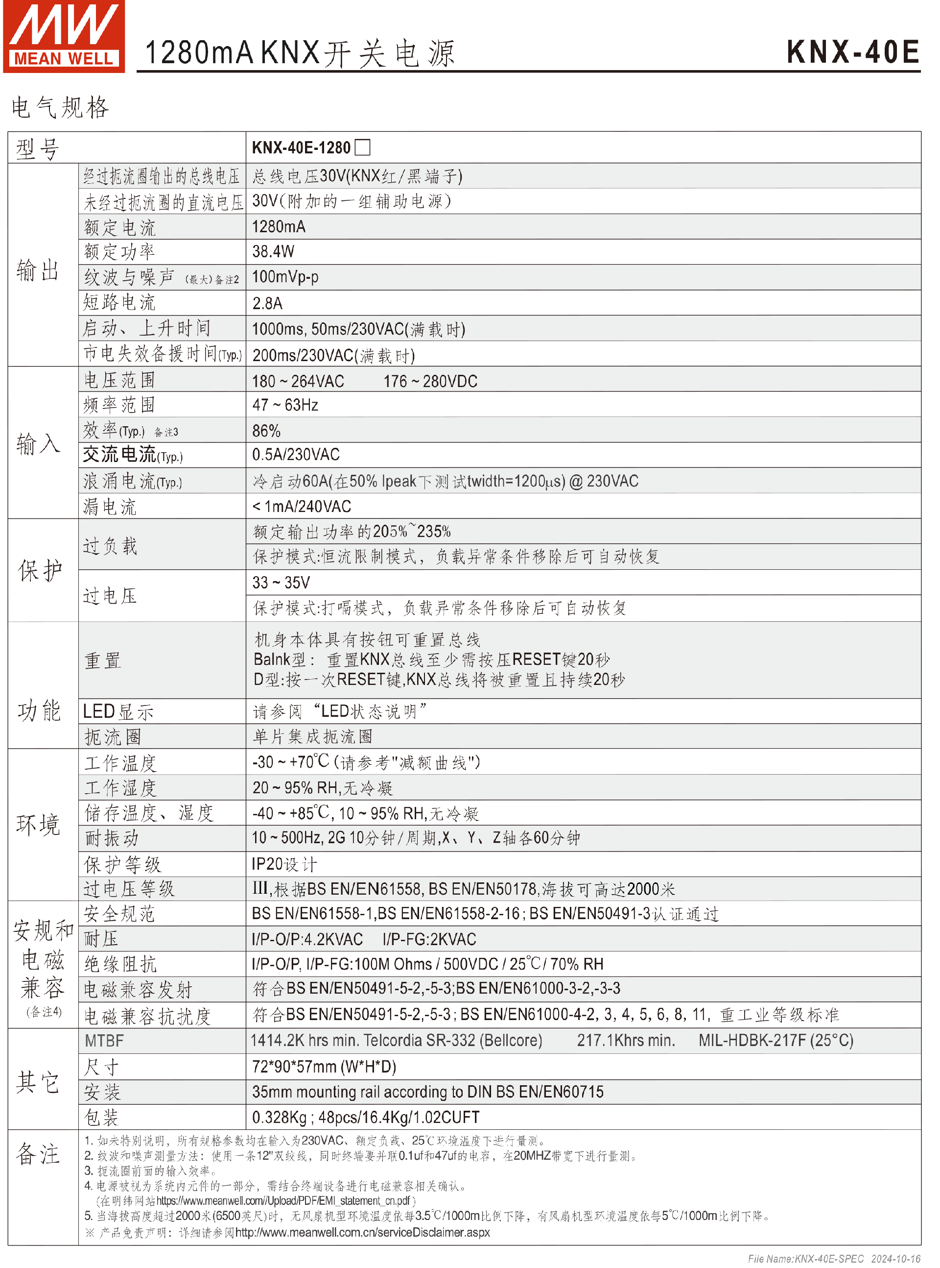 • 臺(tái)灣明緯1280mA KNX開關(guān)電源KNX-40E-1280(D)