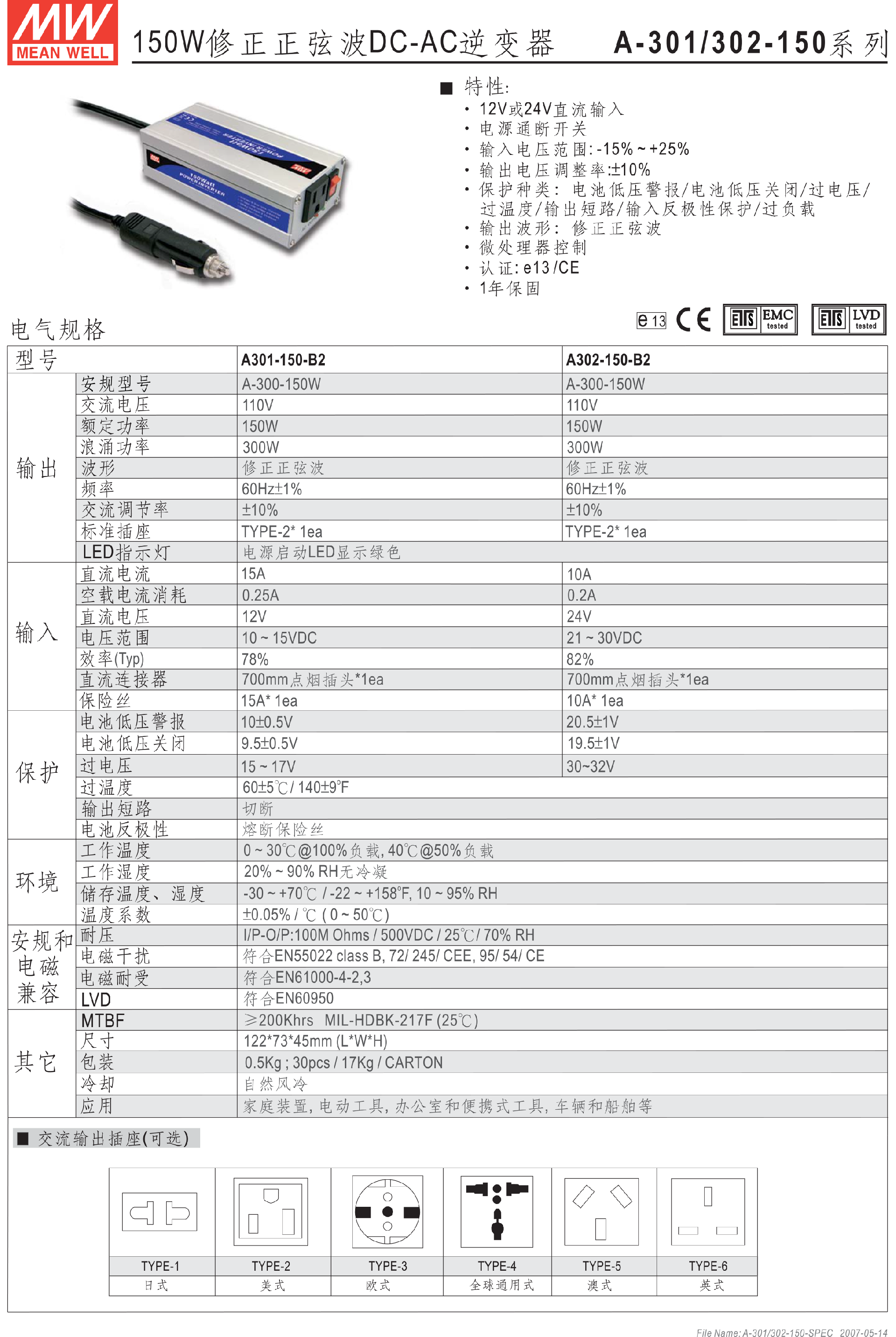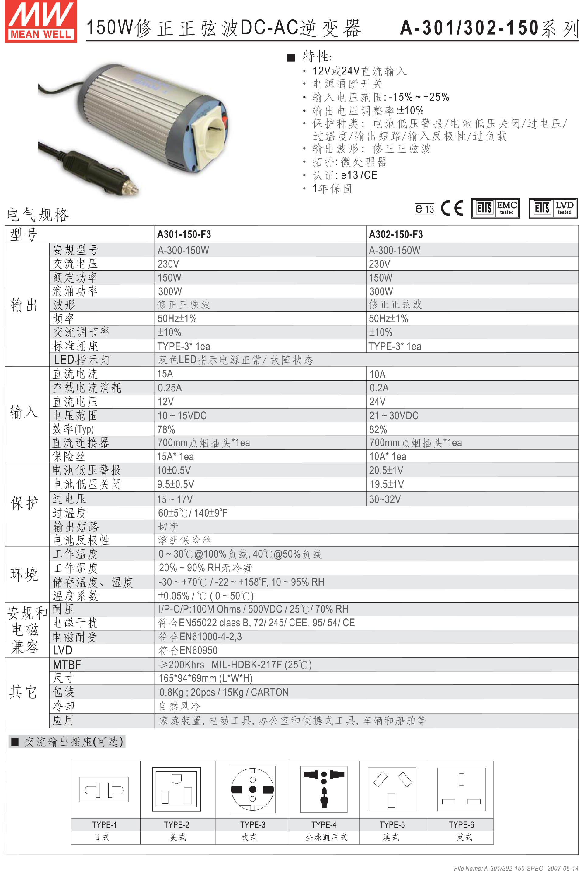 明緯150W修正正弦波DC-AC逆變器A301-150-B2-A301/302系列-東莞市誠緯實業(yè)有限公司-