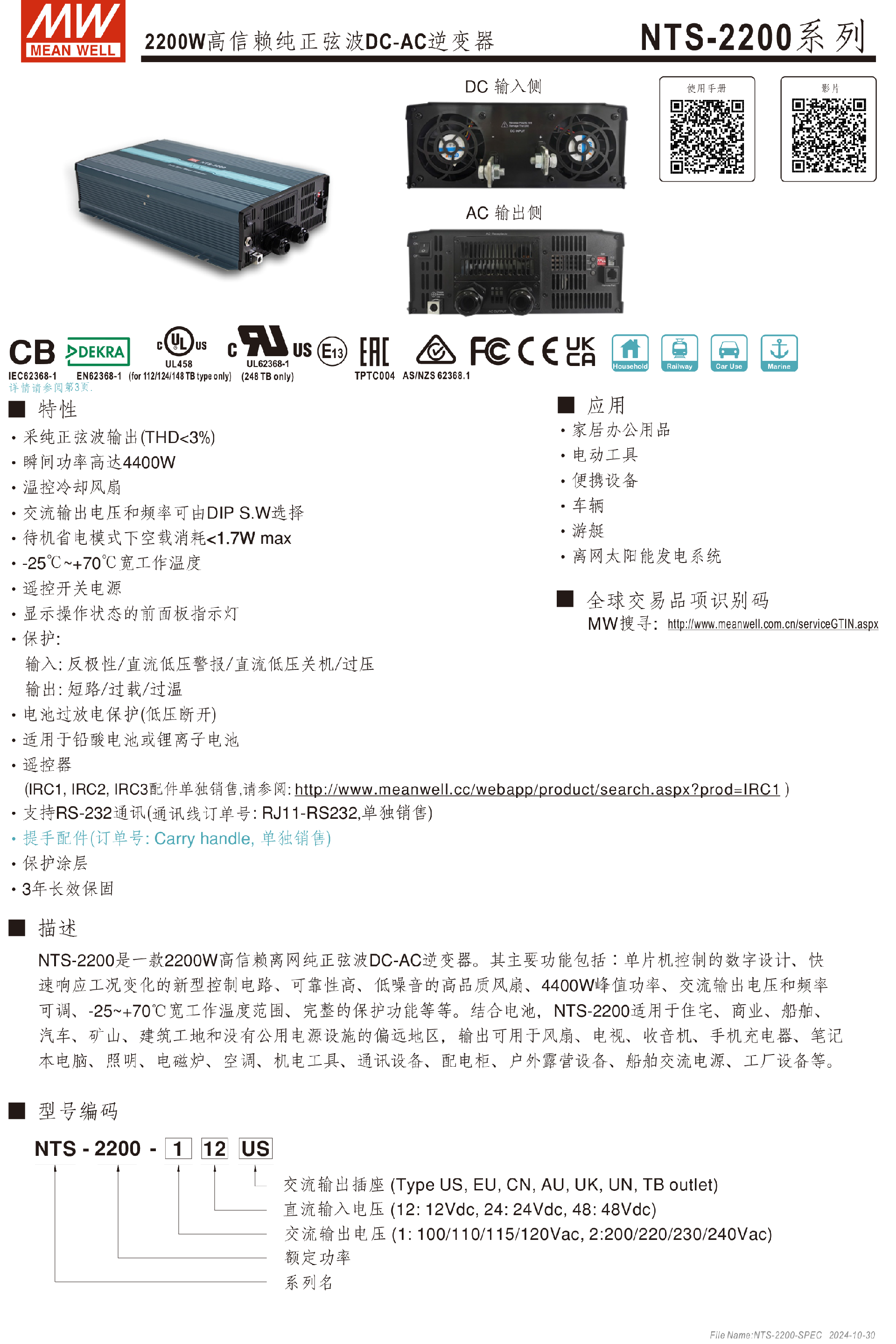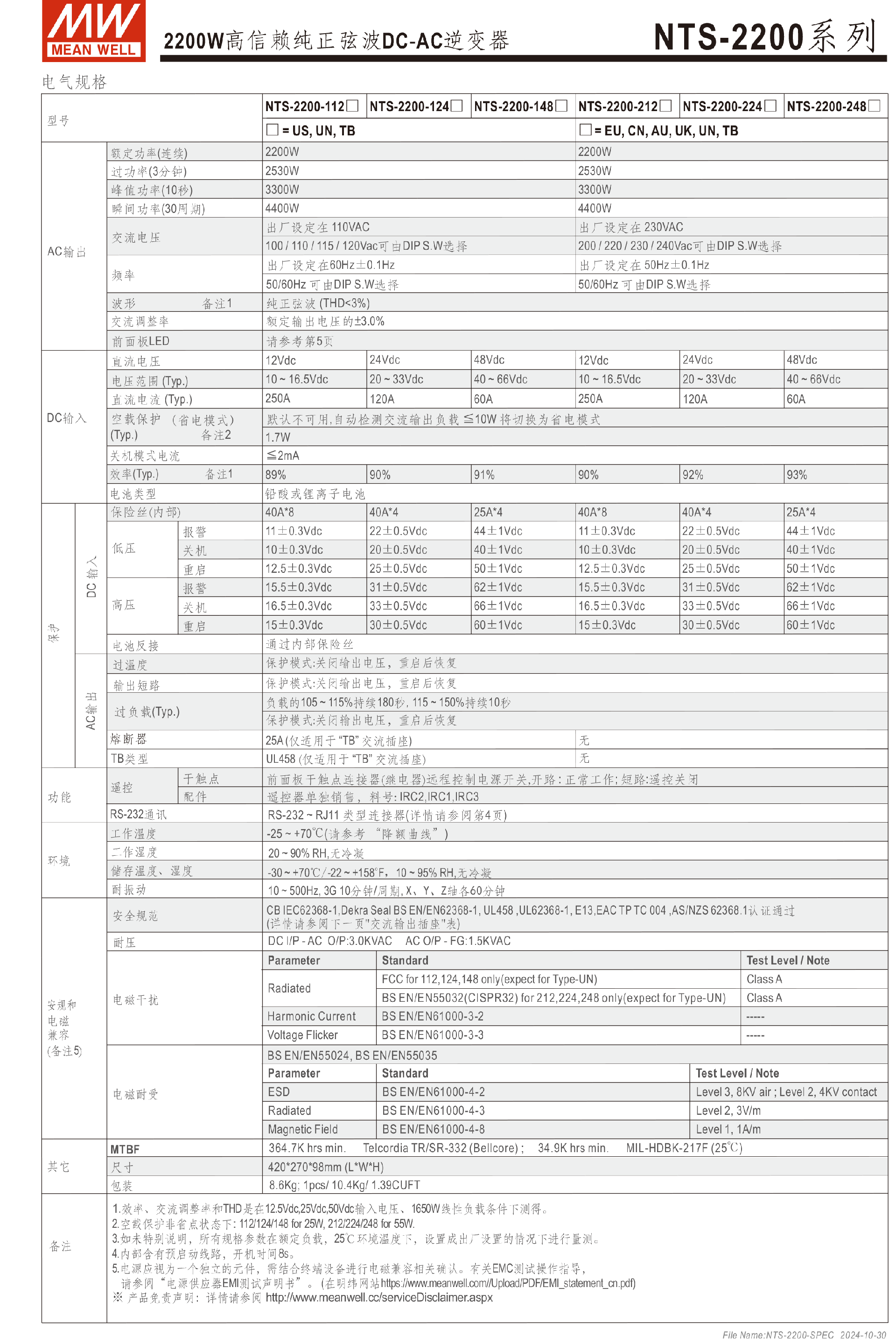 臺(tái)灣明緯NTS-1200系列DC-AC逆變器
