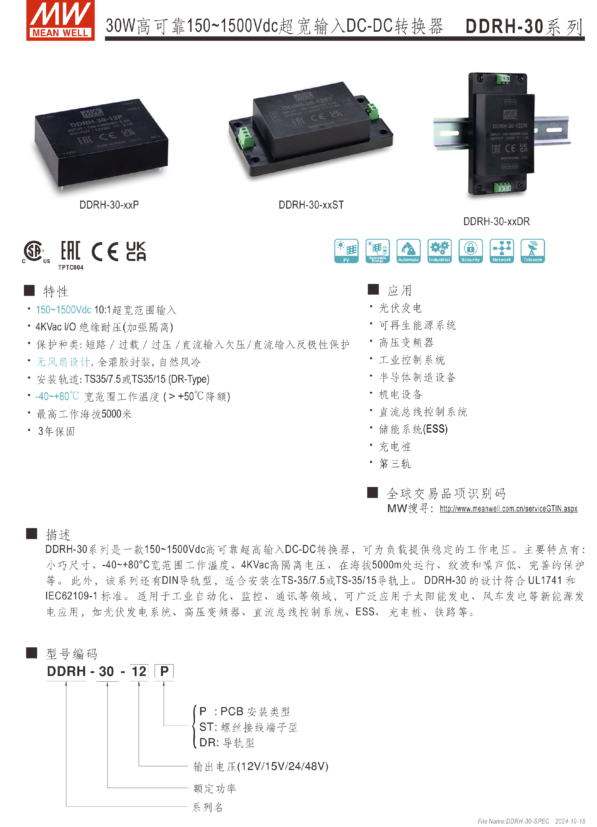 明緯電源DDRH-120系列250~1500Vdc超寬輸入DC-DC轉(zhuǎn)換器