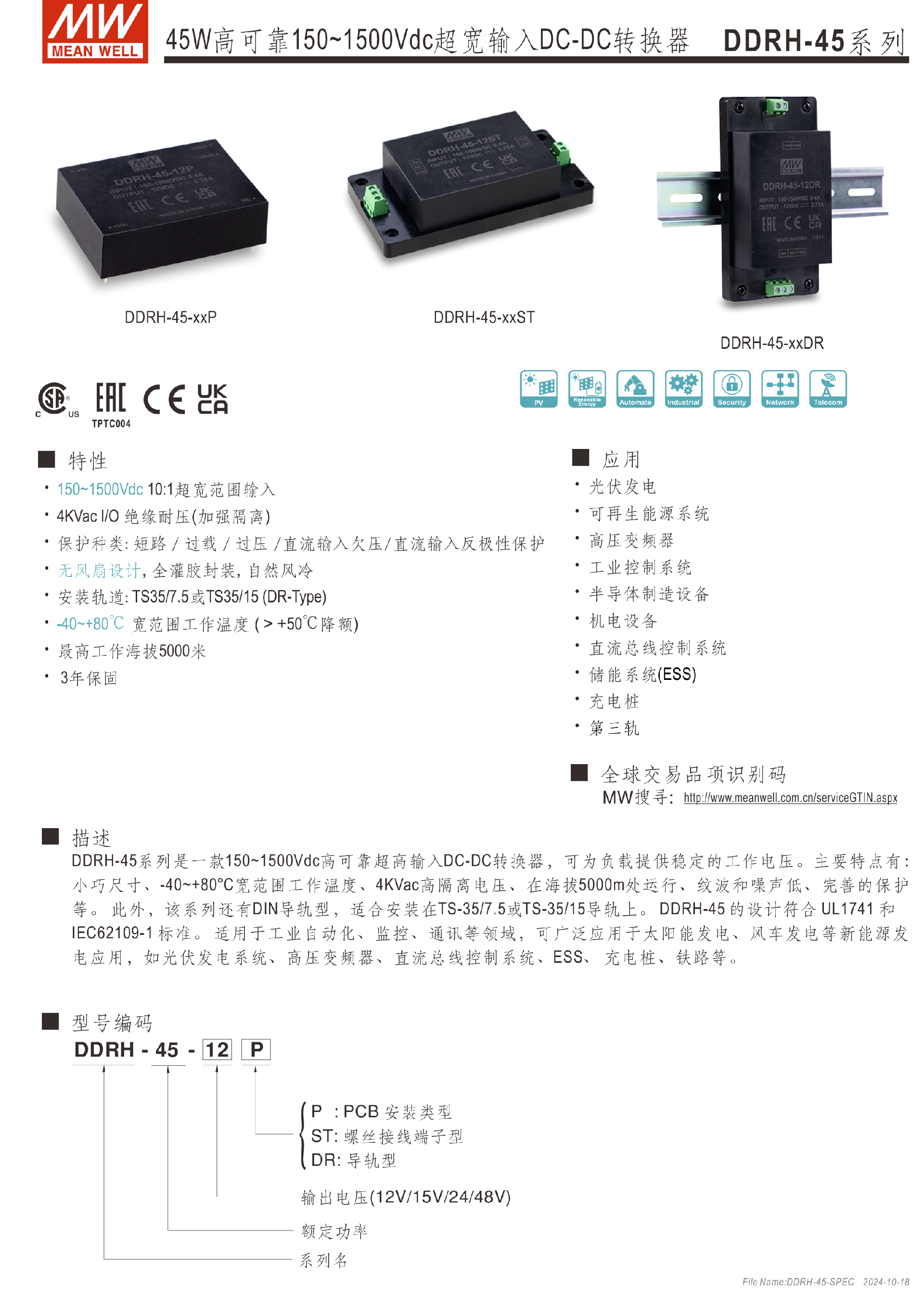 明緯電源DDRH-120系列250~1500Vdc超寬輸入DC-DC轉(zhuǎn)換器