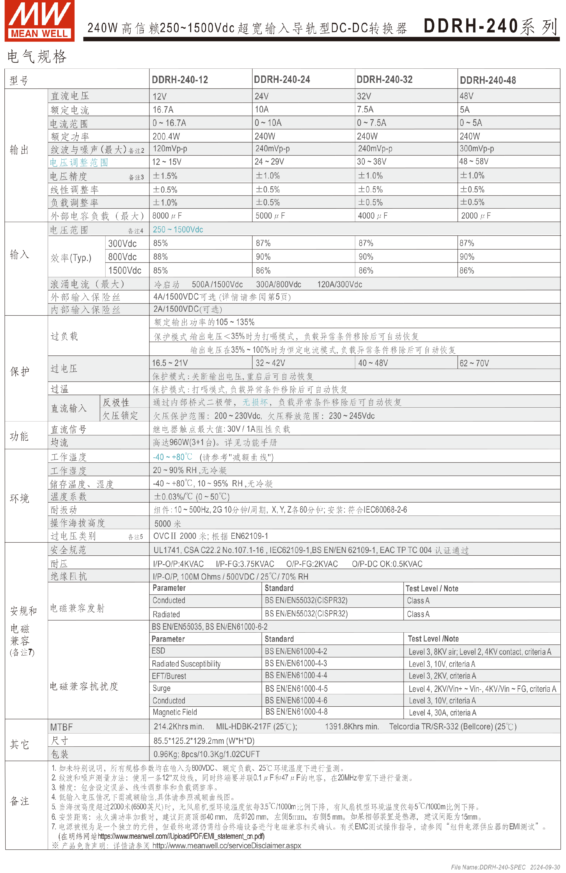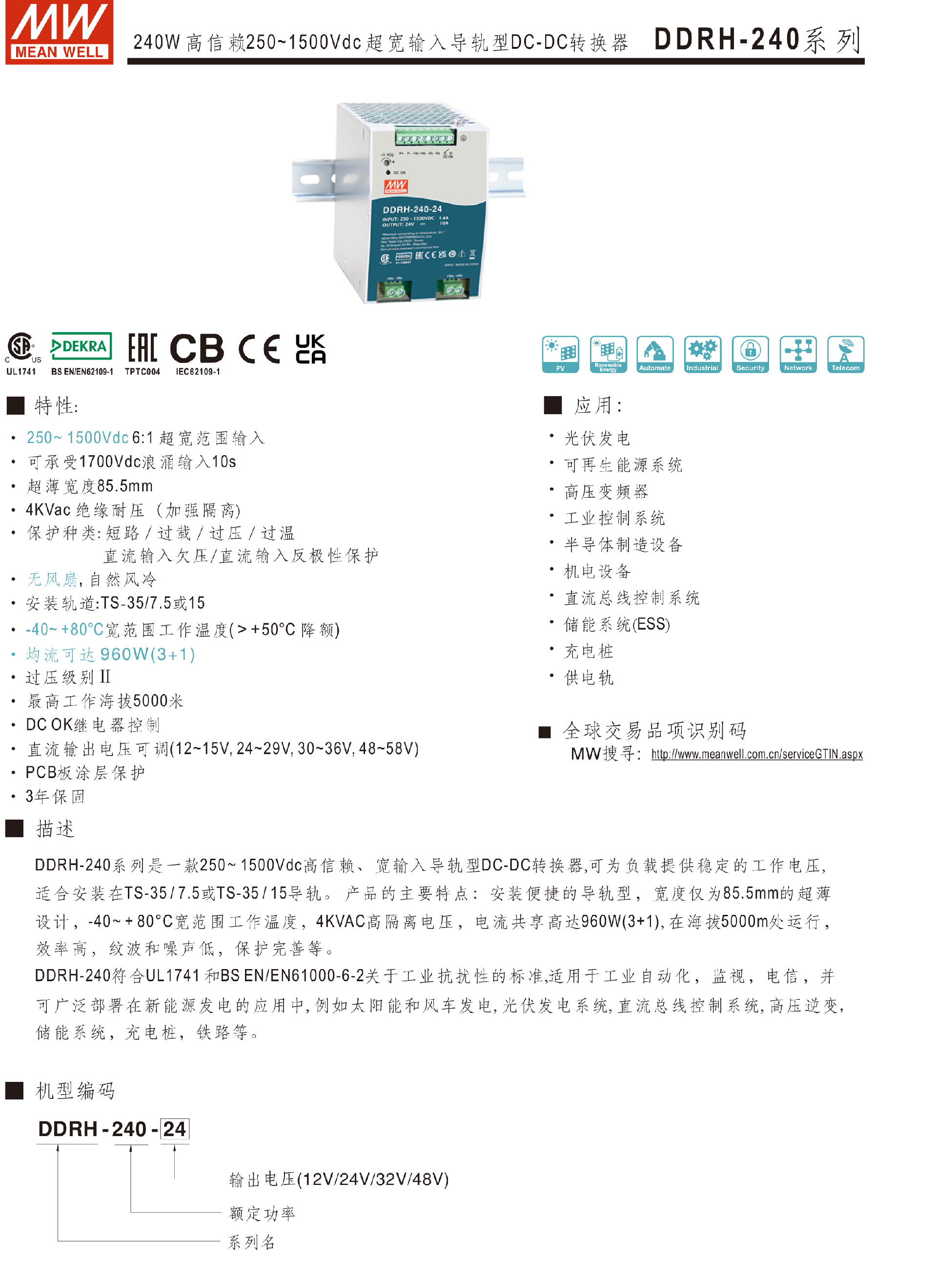 明緯電源DDRH-120系列250~1500Vdc超寬輸入DC-DC轉(zhuǎn)換器