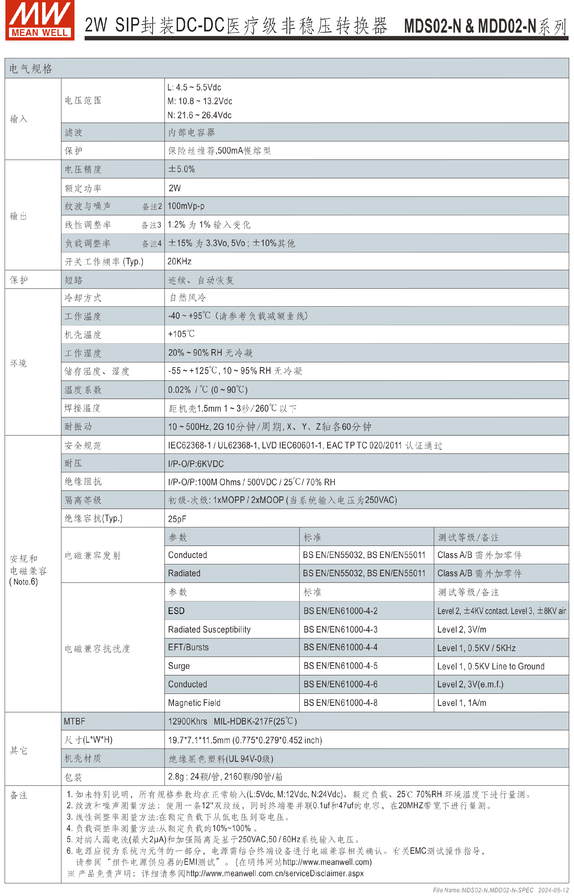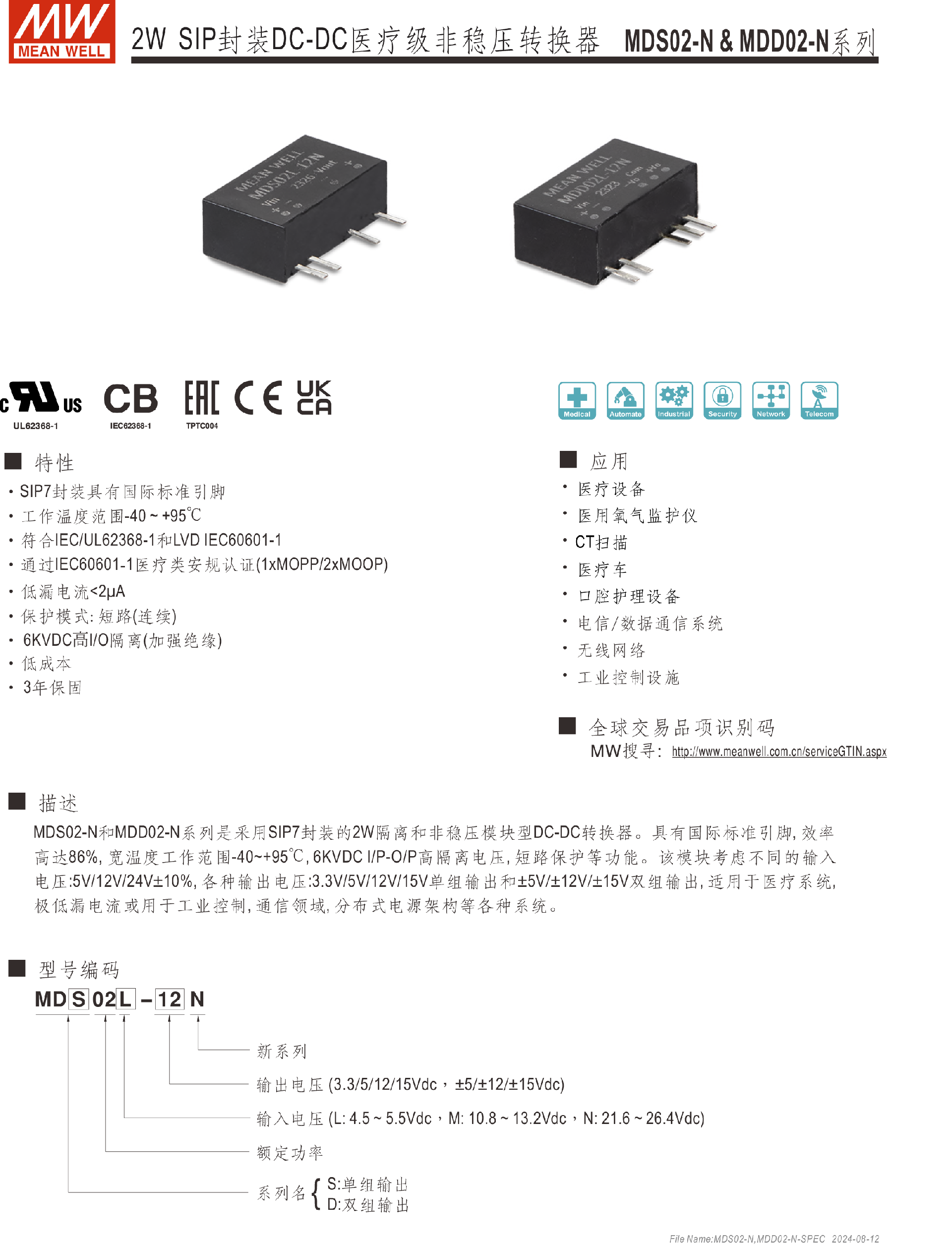 明緯電源MDS06單組MDD06雙組6W DIP封裝DC-DC醫(yī)療級穩(wěn)壓轉(zhuǎn)換器