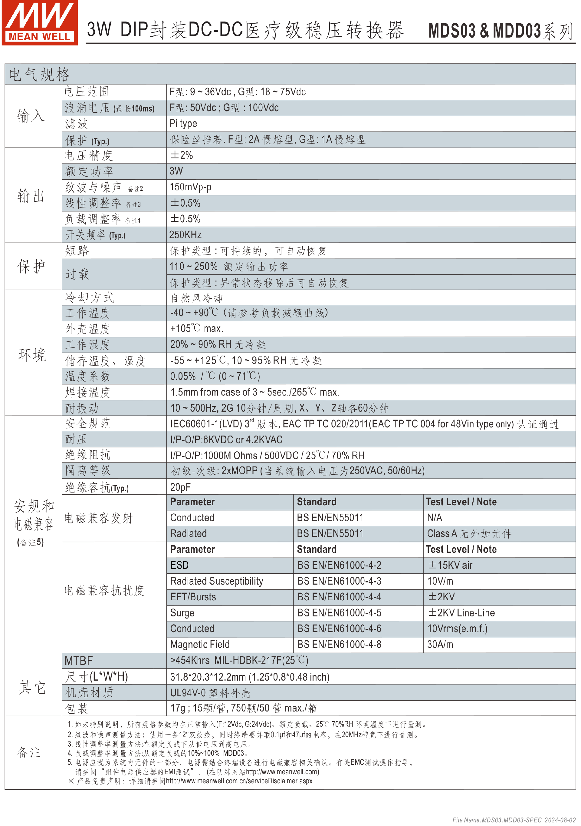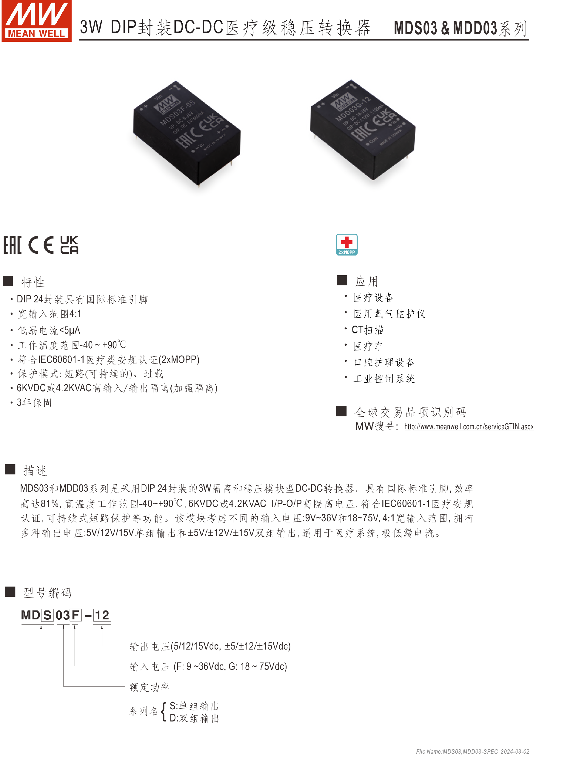 明緯電源MDS03單組MDD03雙組3W DIP封裝DC-DC醫(yī)療級(jí)穩(wěn)壓轉(zhuǎn)換器-MD系列—醫(yī)療型-東莞市誠(chéng)緯實(shí)業(yè)有限公司-