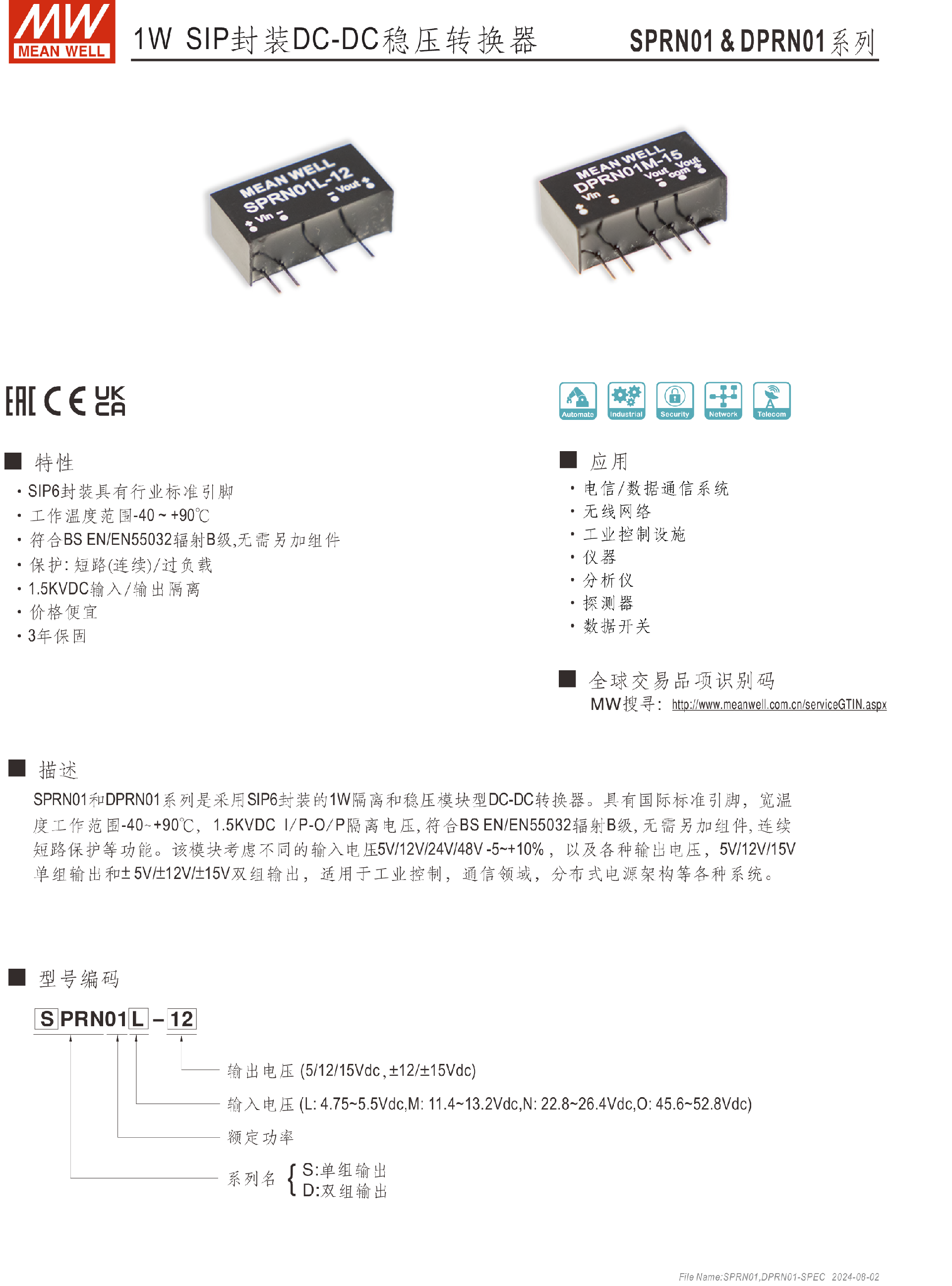 明緯電源SPA01系列1W DC-DC穩(wěn)壓單組輸出變換器