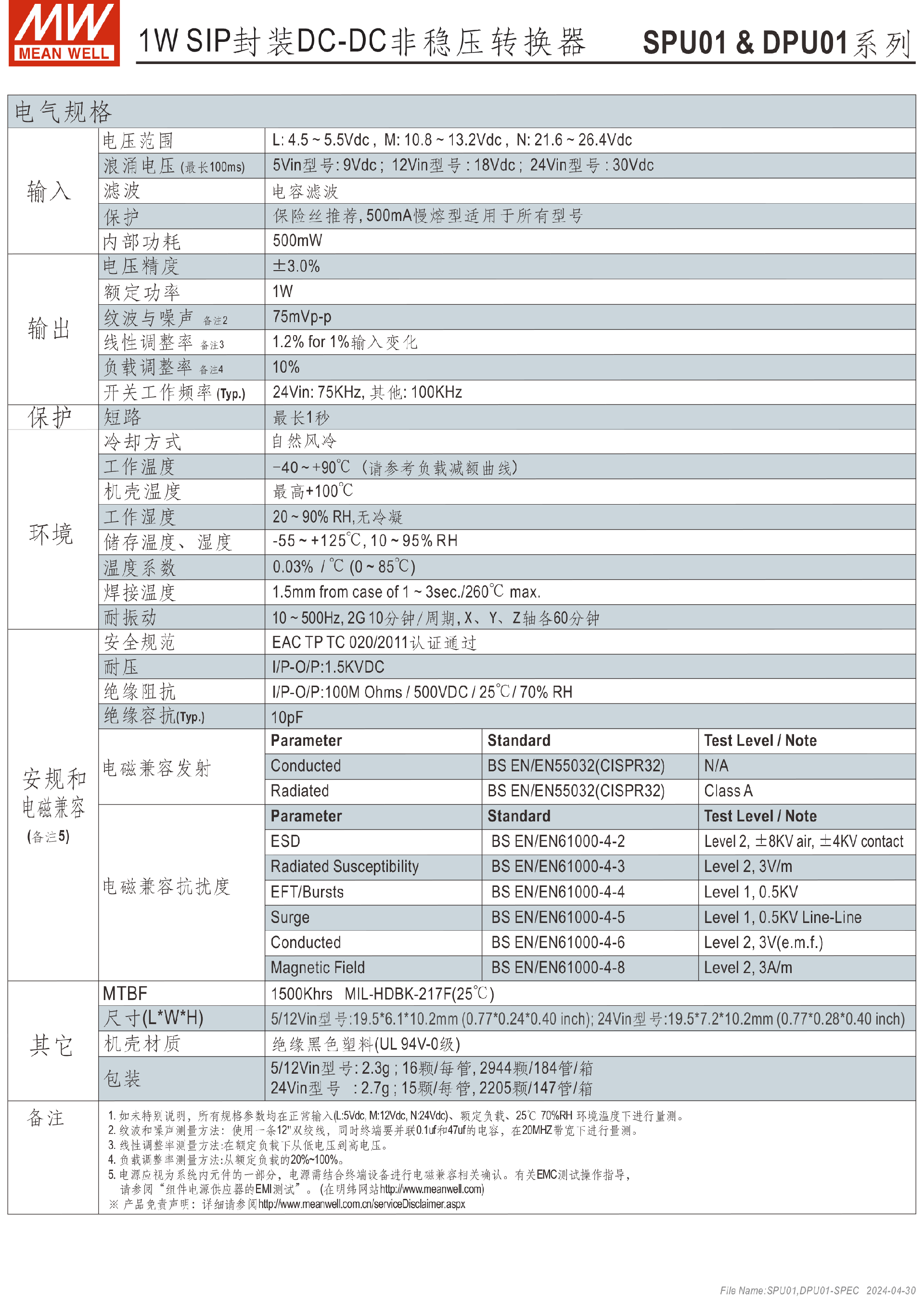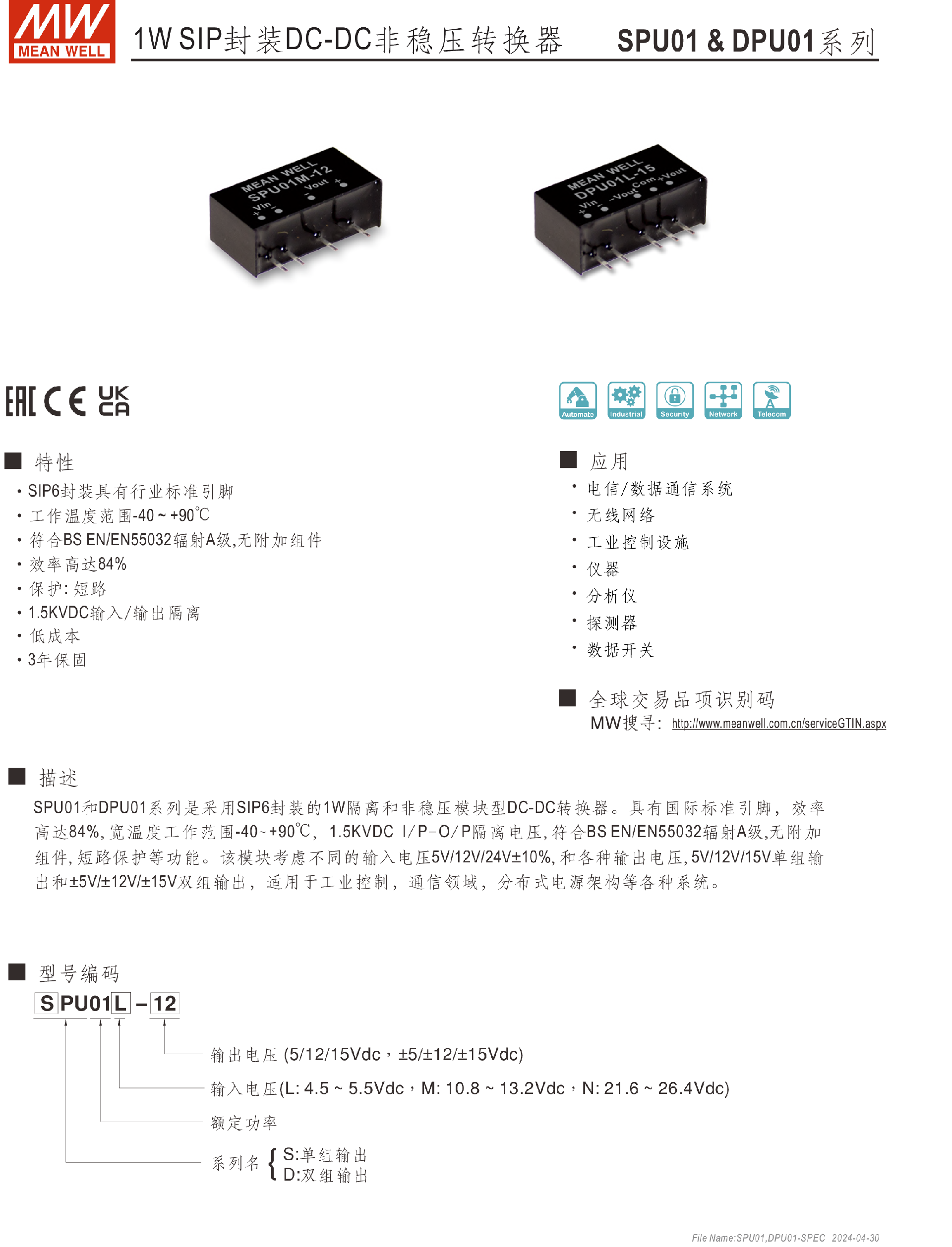 明緯電源SPU01單組DPU01雙組1W SIP封裝DC-DC非穩(wěn)壓轉換器-SIP系列-東莞市誠緯實業(yè)有限公司-