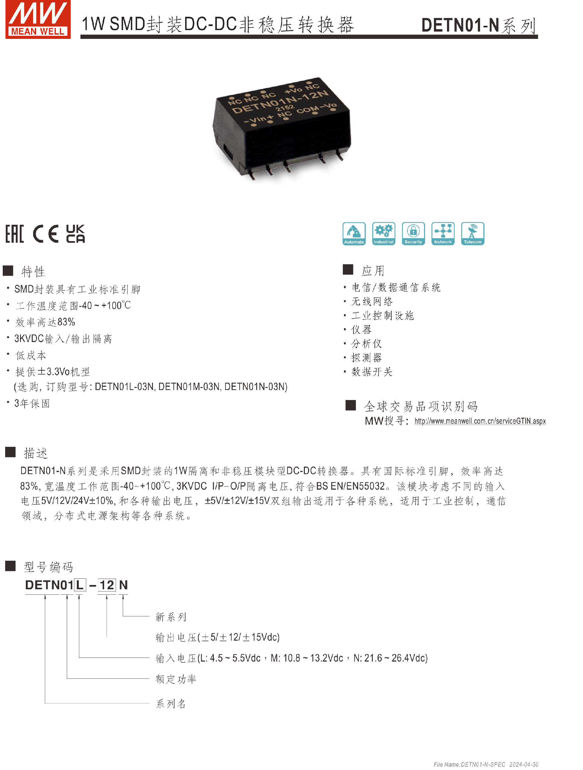 明緯電源DETN01系列1W SMD封裝DC-DC非穩(wěn)壓轉(zhuǎn)換器