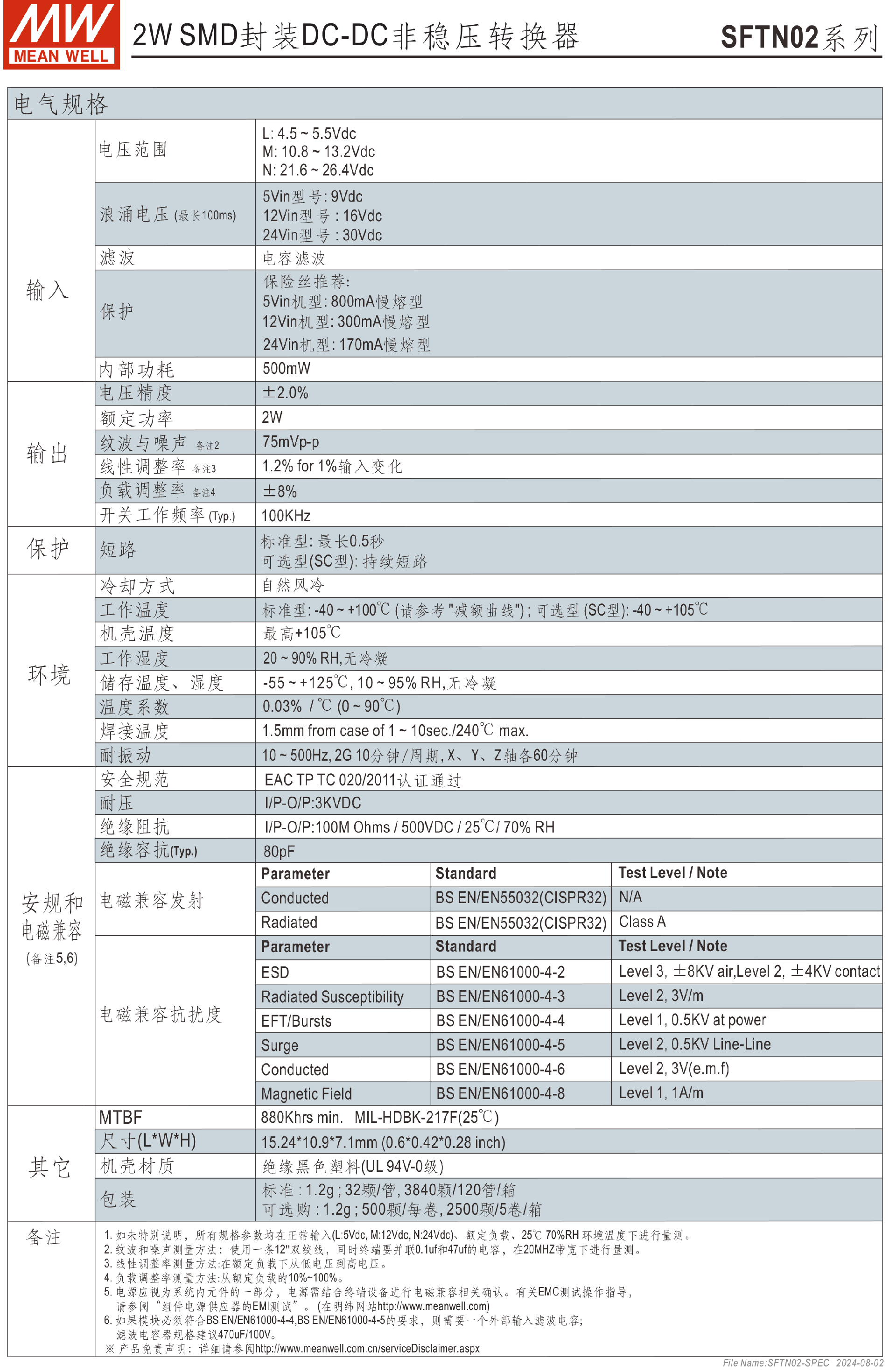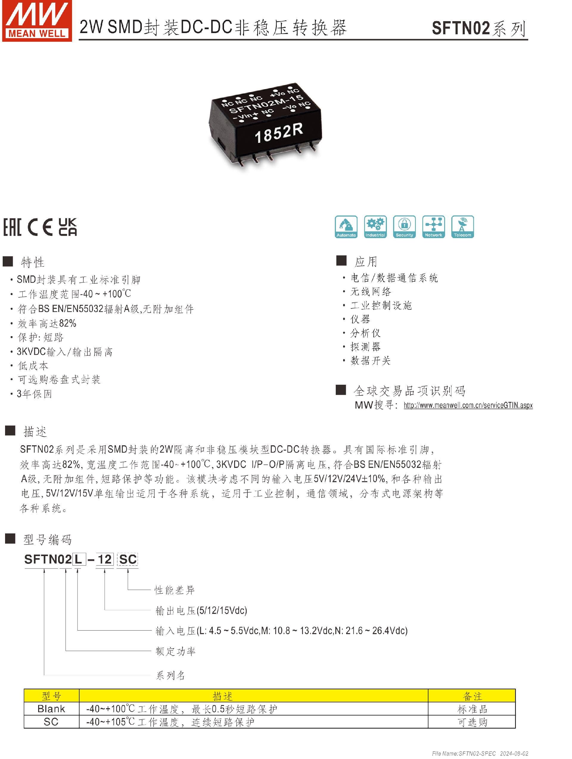 明緯電源SFTN02-N系列2W SMD封裝DC-DC非穩(wěn)壓轉(zhuǎn)換器