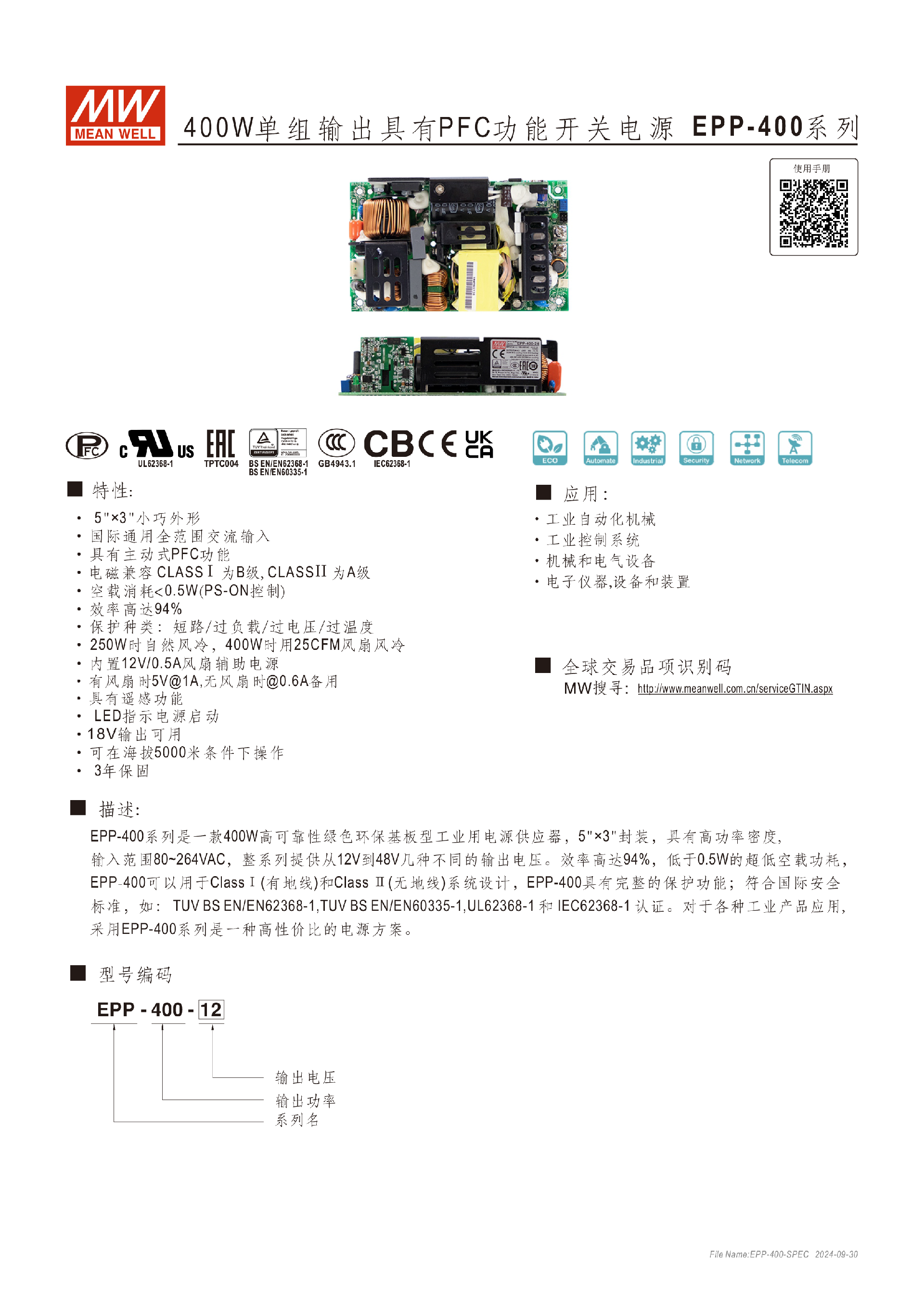 臺(tái)灣明緯EPP-120S系列120W基板型電源供應(yīng)器