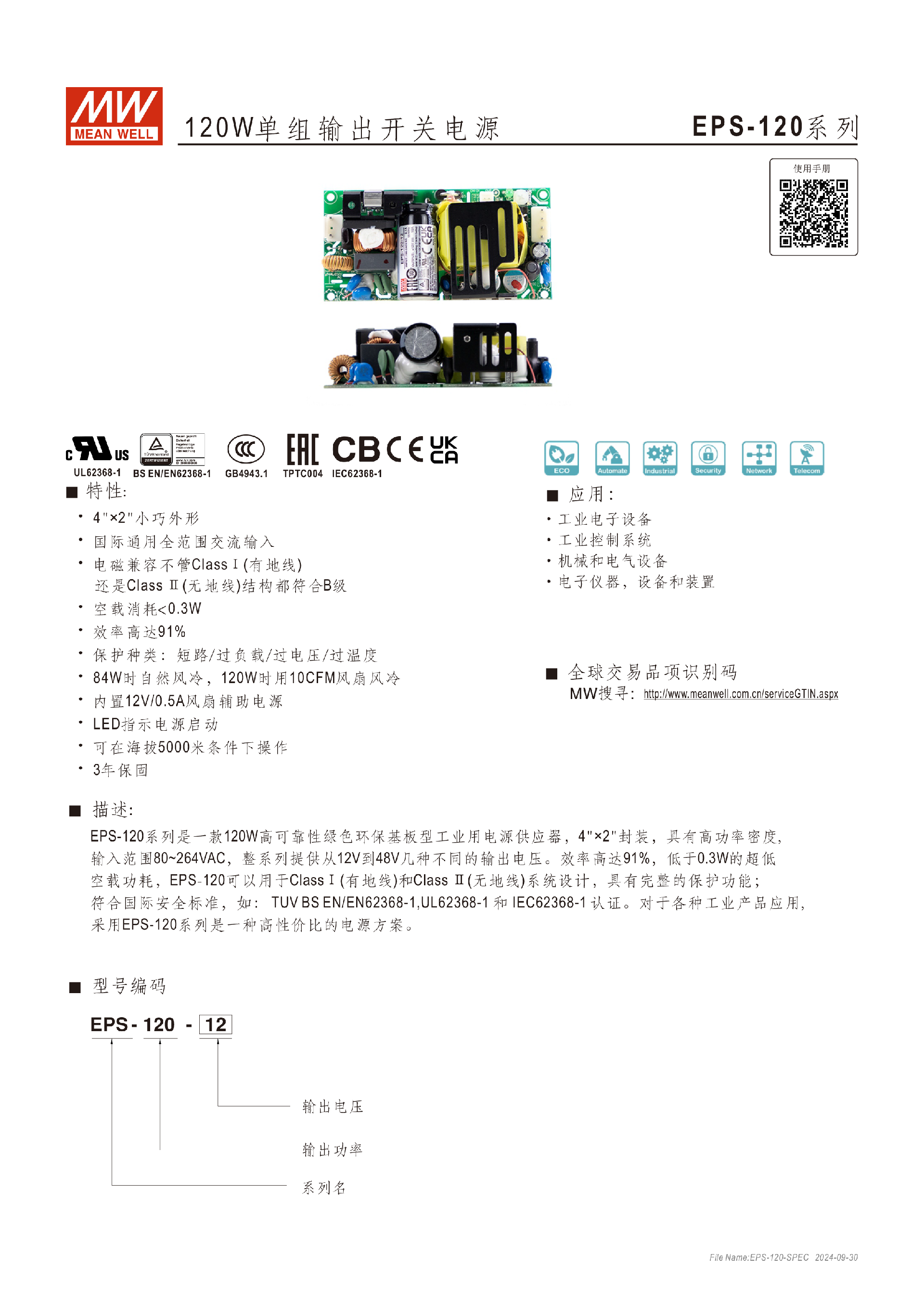臺(tái)灣明緯EPP-100系列100W單組輸出開關(guān)電源