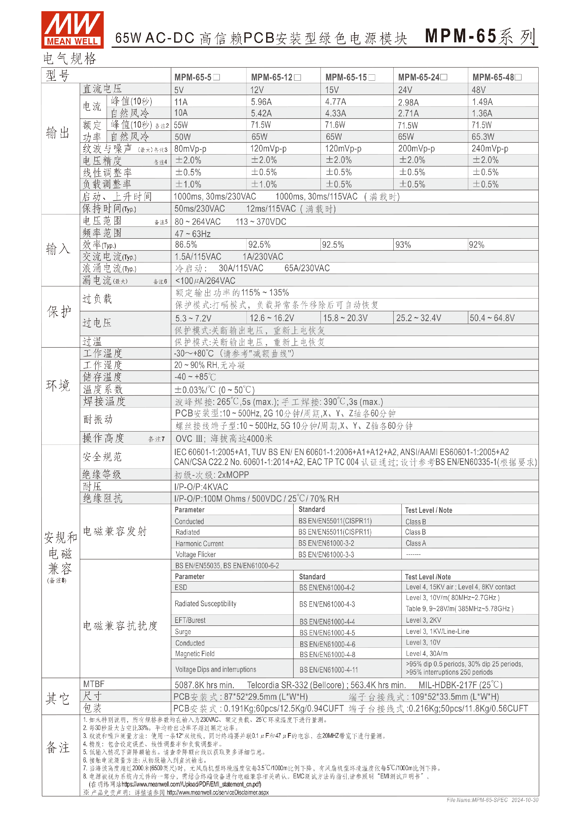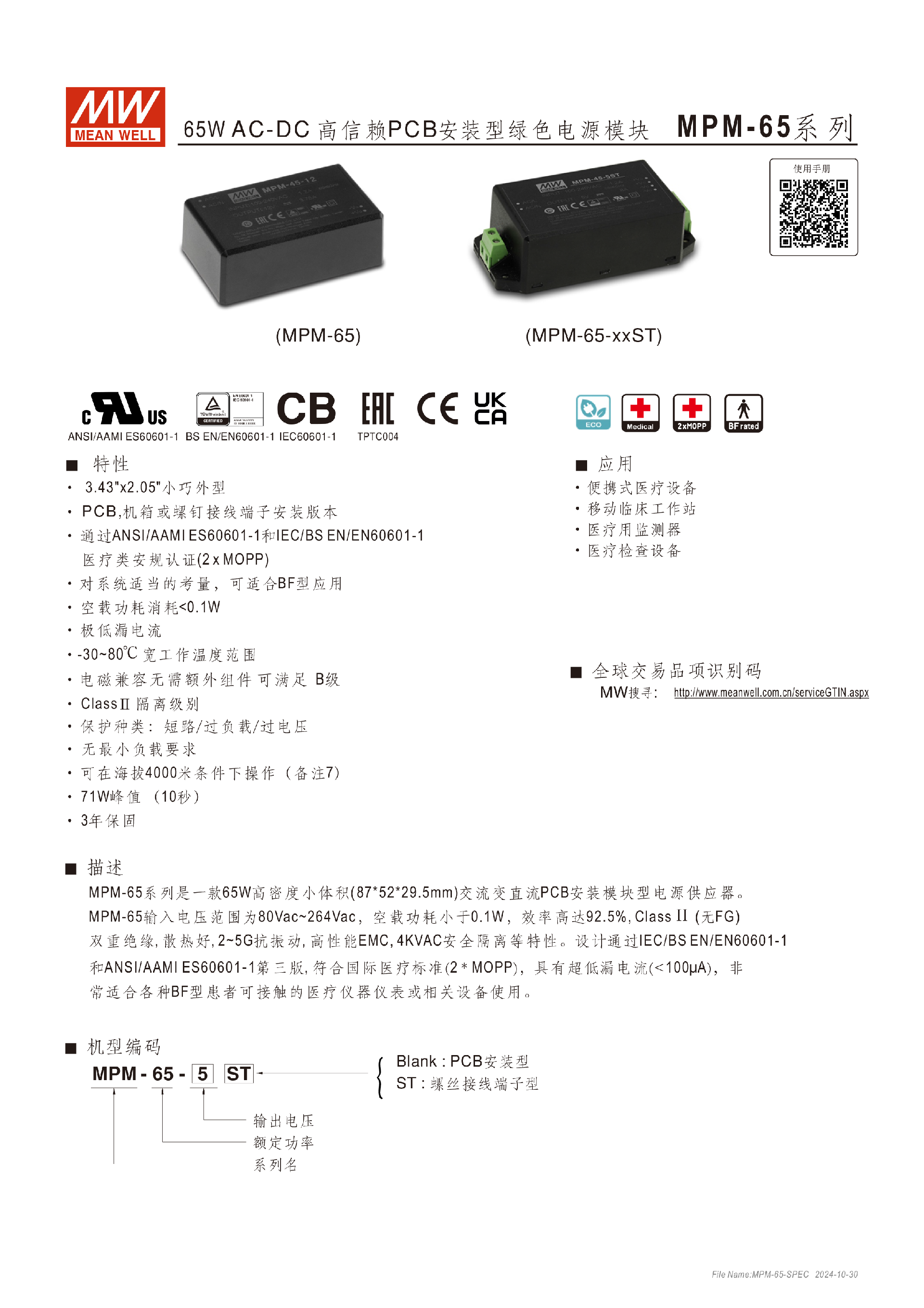 臺灣明緯MPM-65系列PCB安裝電源模塊-醫(yī)療用-東莞市誠緯實業(yè)有限公司-